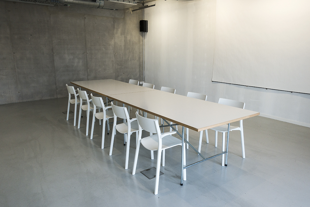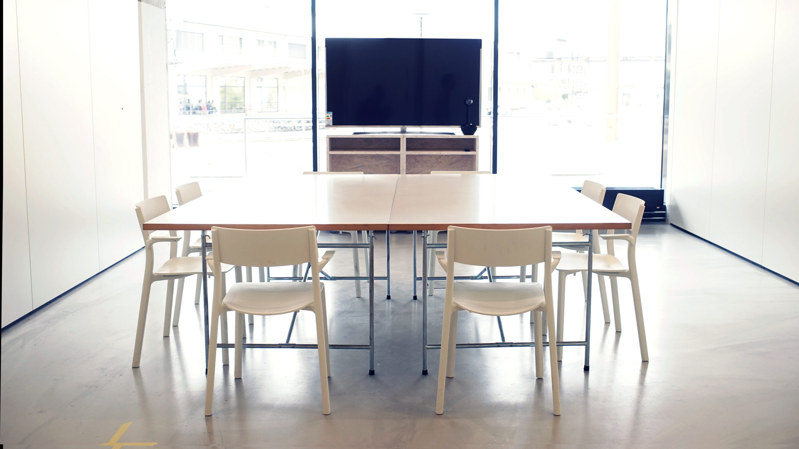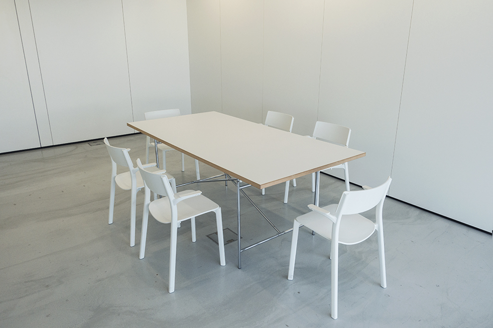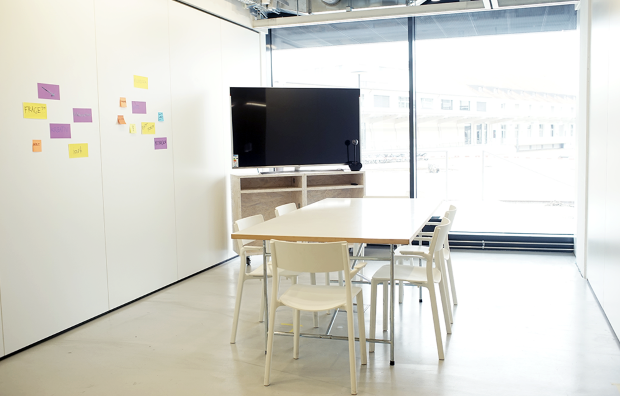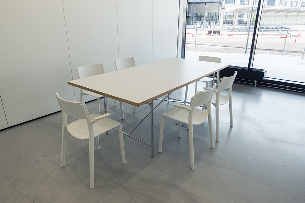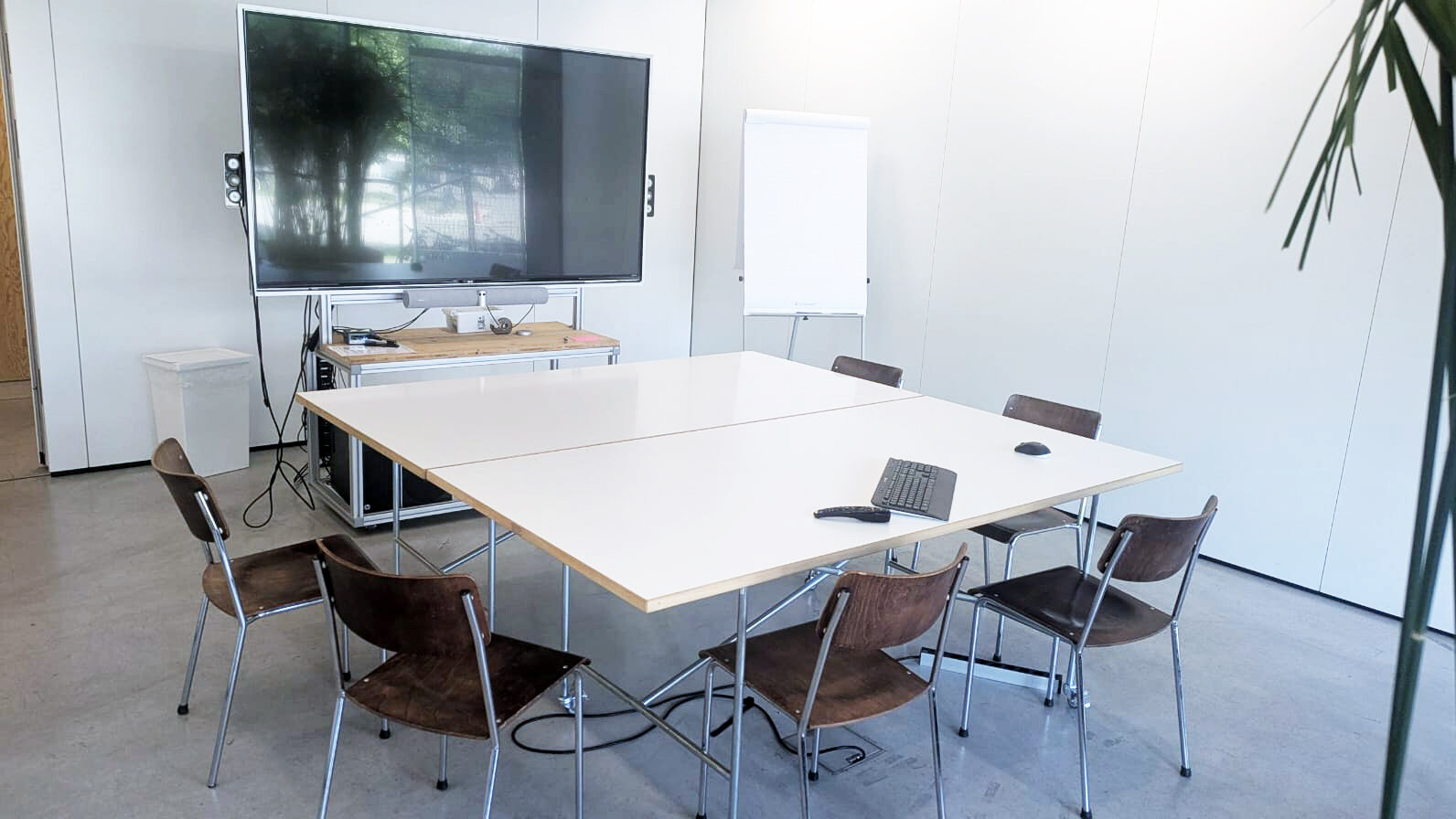 Tisch, Stühle, mobiler Bildschirm (auch für Videokonferenzen), Flipchart, Highspeed-Internet, Reinigung