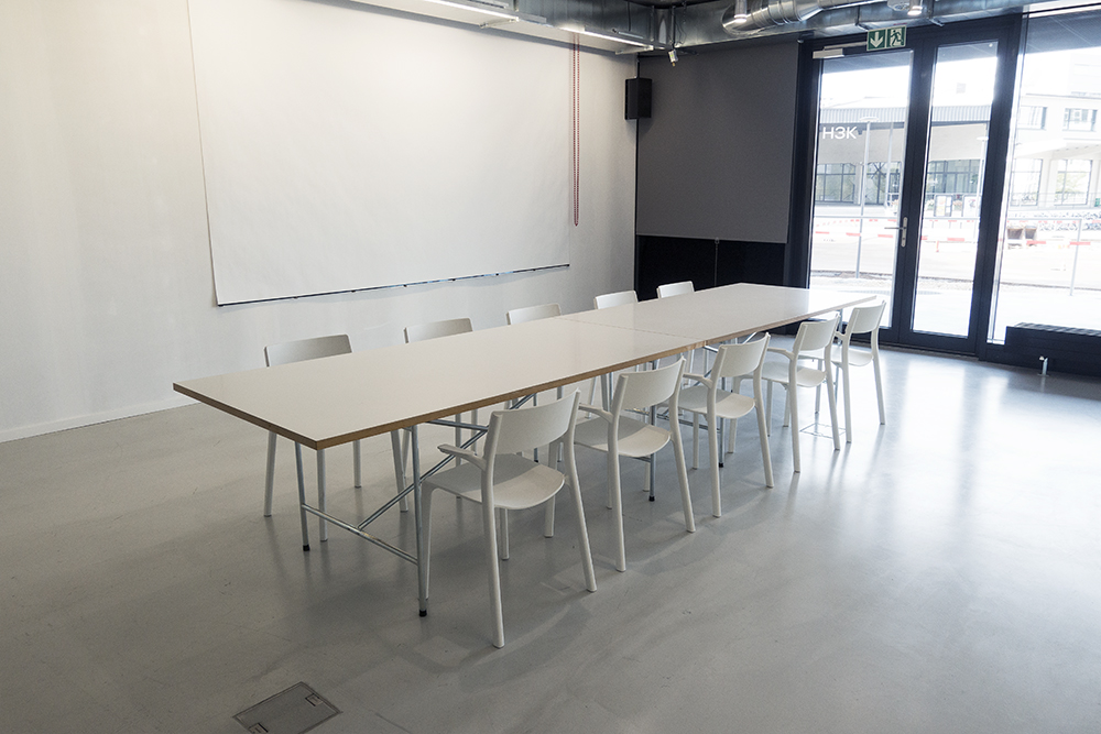 Tisch, Stühle, Multiscreen-Beamer (auch für Videokonferenzen), Flipchart, Highspeed-Internet, Reinigung