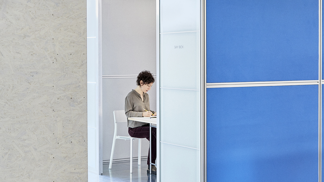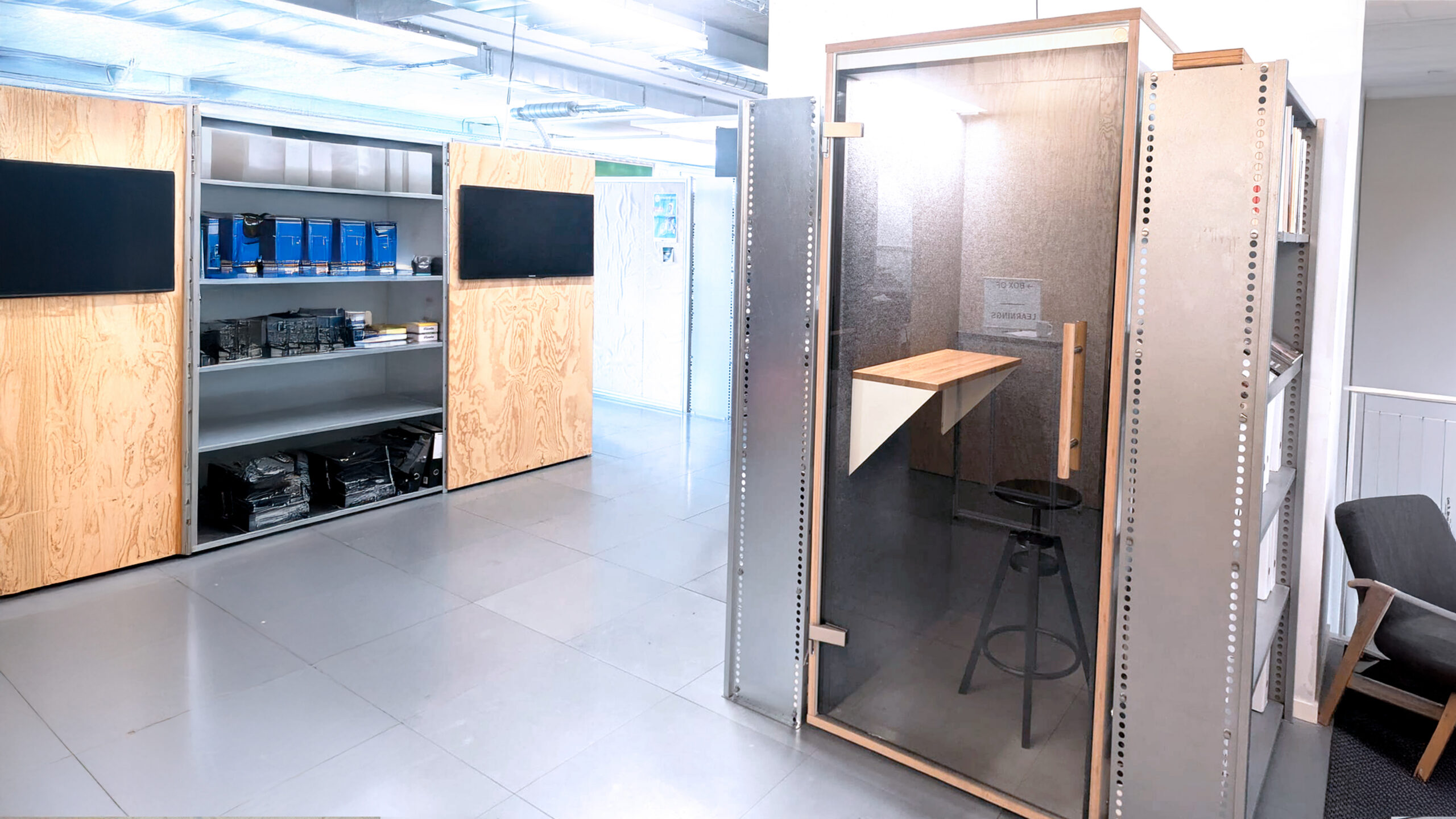 Die Meeting Boxen im Obergeschoss bieten flexible Räume für fokussierte Arbeit, Teammeetings oder vertrauliche Gespräche.